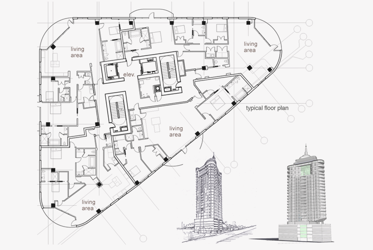 80 units, 26 story multi-family condominium building located in the Galleria area. The bottom 8 stories are for garage use and the 9th floor is a controlled common area with several leisure rooms for the residents and their visitors. The triangle shaped floor plan was designed accordingly to fit the site requirements.